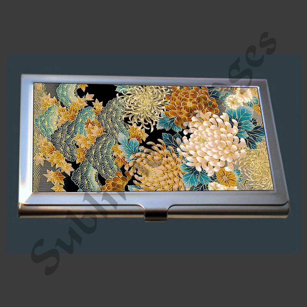 This is a chrome Business Card Case measuring 3 5/8″ x 2 3/8″ x 5/16″ thick. The case is defined by sleek curves and contours. The cover is decorated with a high resolution image of a vintage kimono design detail, and is imprinted by a high quality heat process that guarantees crisp images and vivid colours.