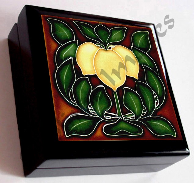 Looking for a beautiful and unique keepsake, valet or jewelry box. We have them here. Our boxes have a polished laquer piano finish with a velvet fabric lining and a ceramic tile lid – choose from a variety of Art Nouveau designs (Product Code KB049). Please read our Full Description below.